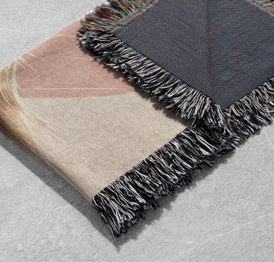 Every blanket is crafted on traditional looms using 100% cotton. Your couple photo becomes part of the woven fabric — not printed on top.